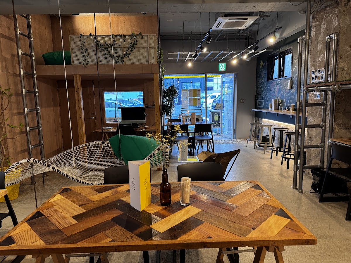 As you step inside, you're greeted by an inviting ambiance that melds modern aesthetics with a hint of whimsy. The quirky seating arrangements, featuring both traditional chairs and fun ladder setups, invite you to explore and settle into your favorite spot. It's the perfect setting for a quiet coffee date, a productive study session, or a leisurely break from the vibrant street life of Tokyo.